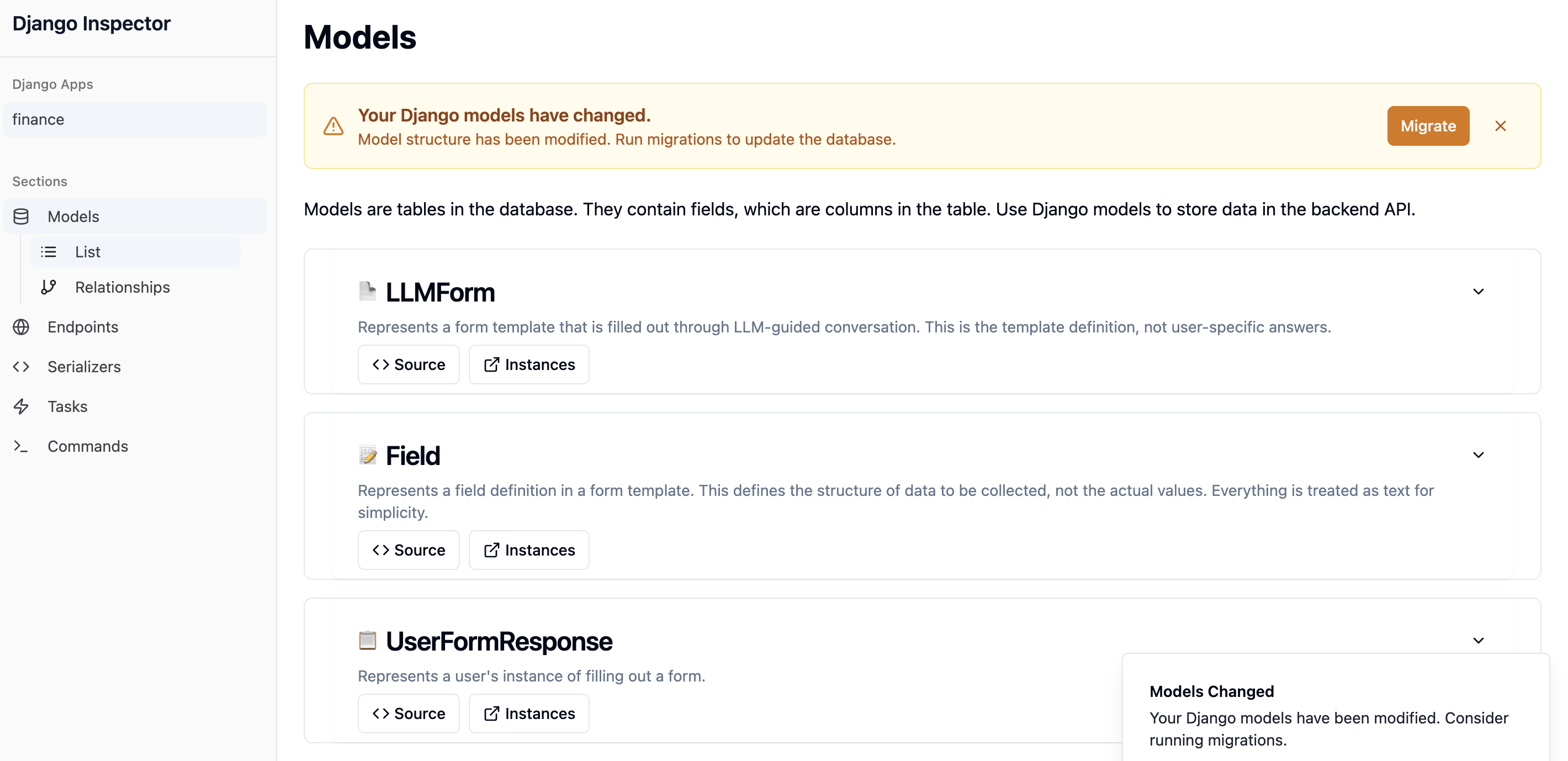 The backend is made of exportable, async-compatible Django code, viewable live in a GUI with glanceable summaries, observability, and tracking of AI changes. No black boxes here.